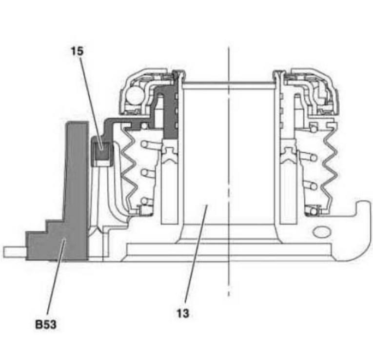 The clutch travel sensor (B53) is rigidly bolted onto the housing of the hydraulic central clutch operator (13). The permanent magnet (15) is also rigidly connected with the thrust element of the hydraulic central clutch operator (13).