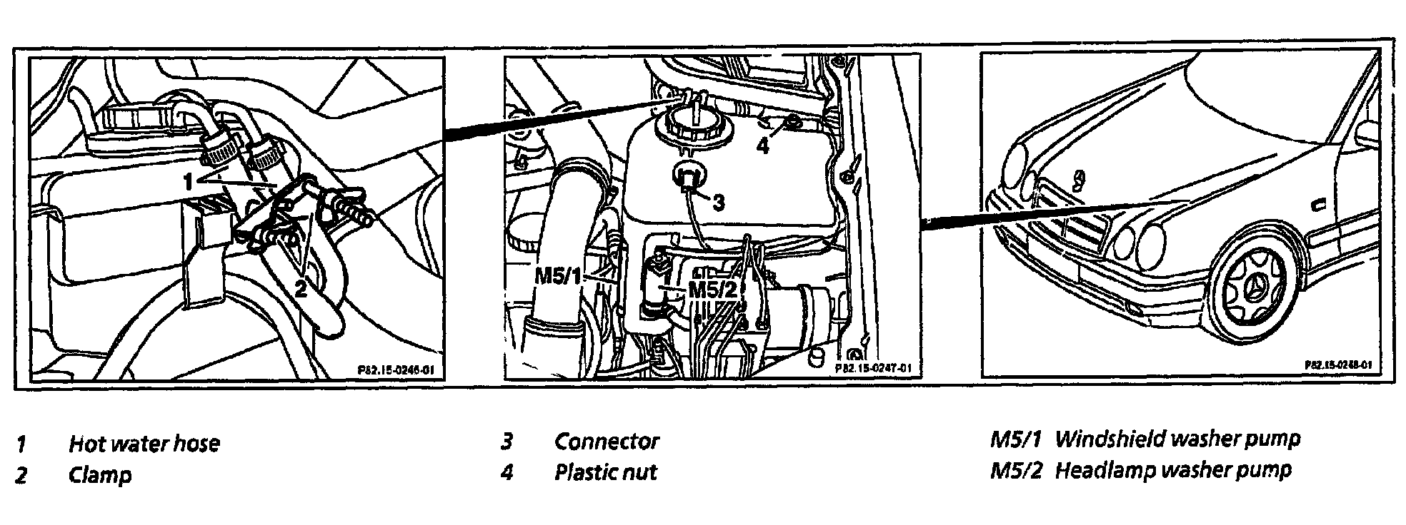 6. Remove winshield washer pump (M5/1) and unclip feed lines from washer reservoir.