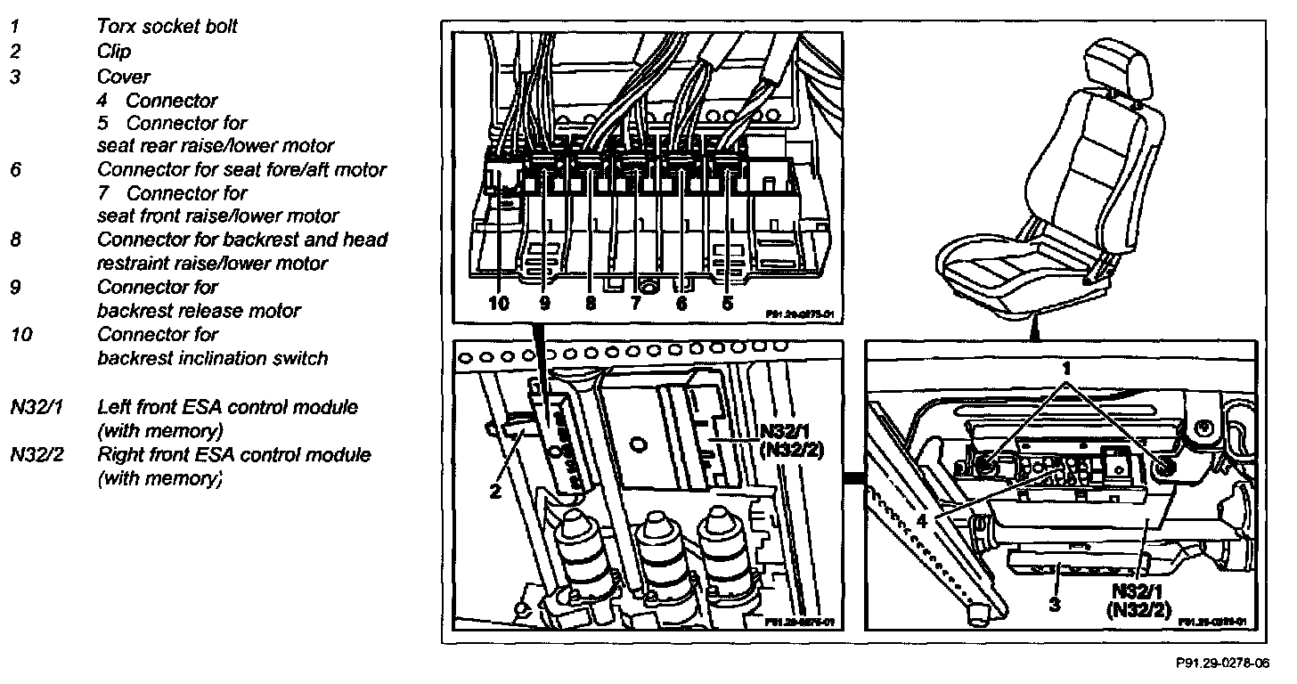 4 Unclip clip (2) from seat subframe and remove left front ESA control module (with memory) (N32/1) or right front ESA control module (with memory) (N32/2)