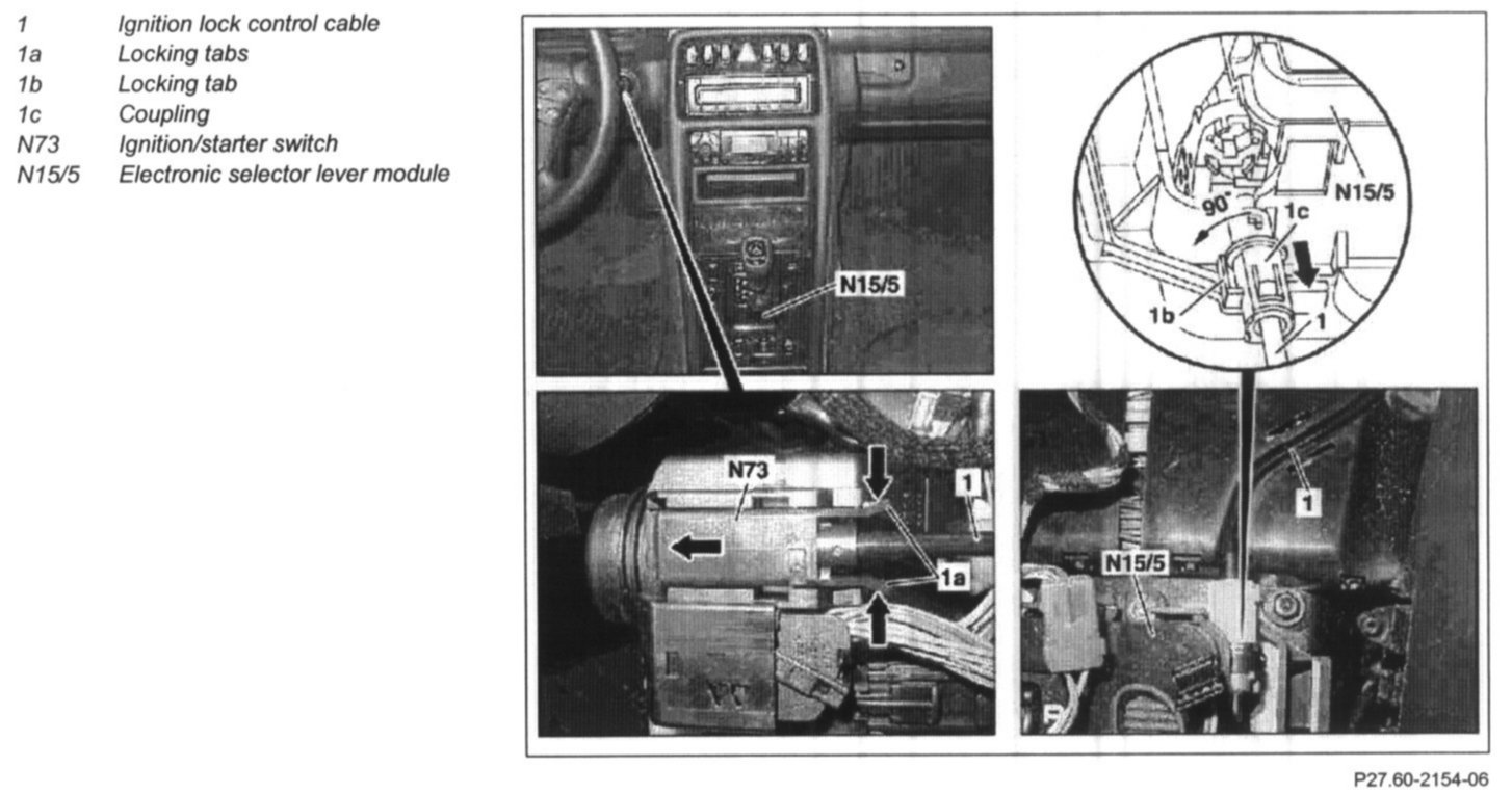 5 Unclip ignition lock cable (1) from electronic selector lever module (N15/5)