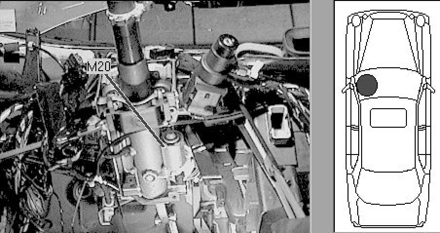 Forward of steering wheel, under dashboard.