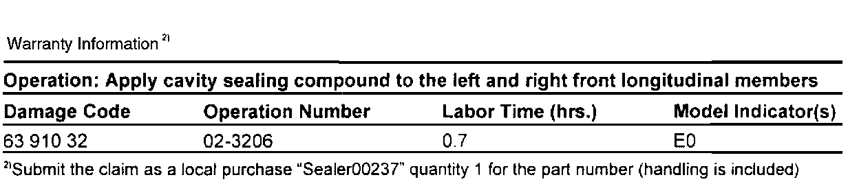 Vehicles listed in the effective serial number range table below require subsequent coating of the left and right front longitudinal members-near the B-pillar-with cavity sealing compound. Please perform this operation on the affected vehicle during the next scheduled service department visit. For the operation procedure, refer to WIS: SM97.20-P-0001A, Subsequently coating front longitudinal member, left and right, with cavity sealing compound."