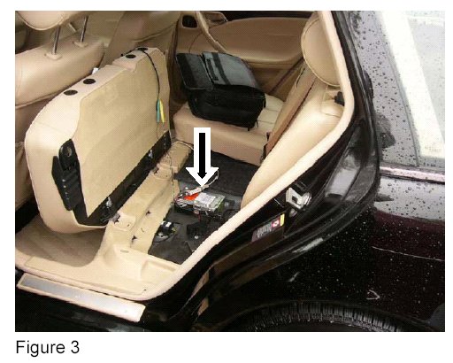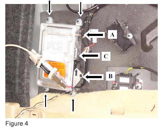 2. Remove the analog Tele Aid control module from beneath the left, rear seat (Arrow, Figure 3) by removing the screws (Arrows, Figure 4)