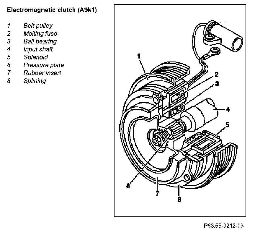 To prevent a mechanical defect in the refrigerant compressor from causing the poly V-belt to jump loose, the electromagnetic clutch releases itself automatically. With a mechanical defect, the refrigerant compressor rotates more sluggishly or even locks completely.