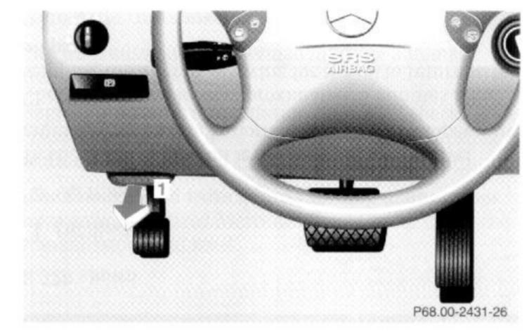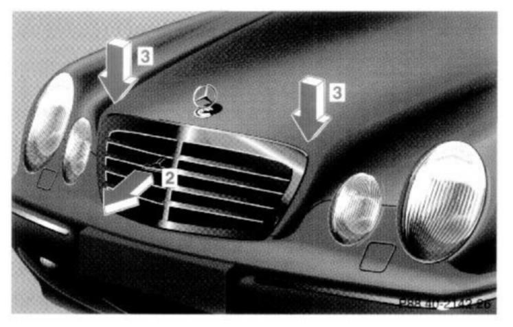 To unlock the hood, pull release lever (1) under the driver's side of the instrument panel. At the same time a handle will extend out of the radiator grill (it may be necessary to lift the hood up slightly).