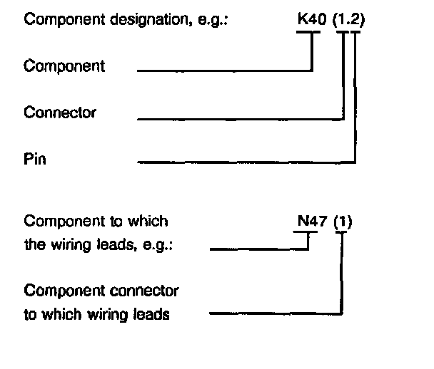 Components are designated in the familiar fashion, e.g. K40. If reference to a particular connection is necessary, it is shown in the format "K40 (1.2)", meaning relay module K40, connector 1, pin 2. Component names are no longer included on the wiring diagram itself, but shown in a separate image beneath the diagram.