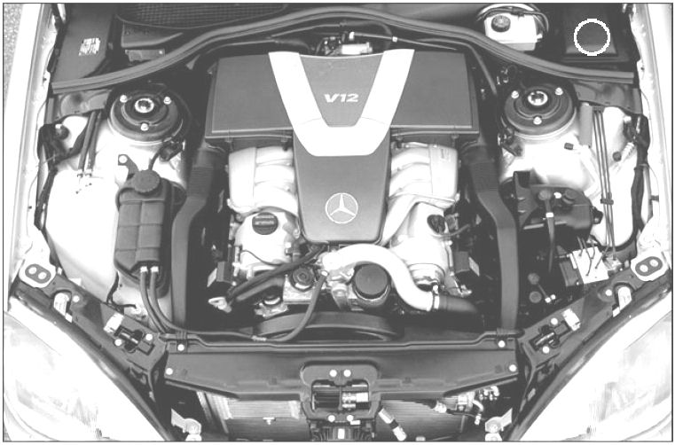engine compartment, left rear (encircled)