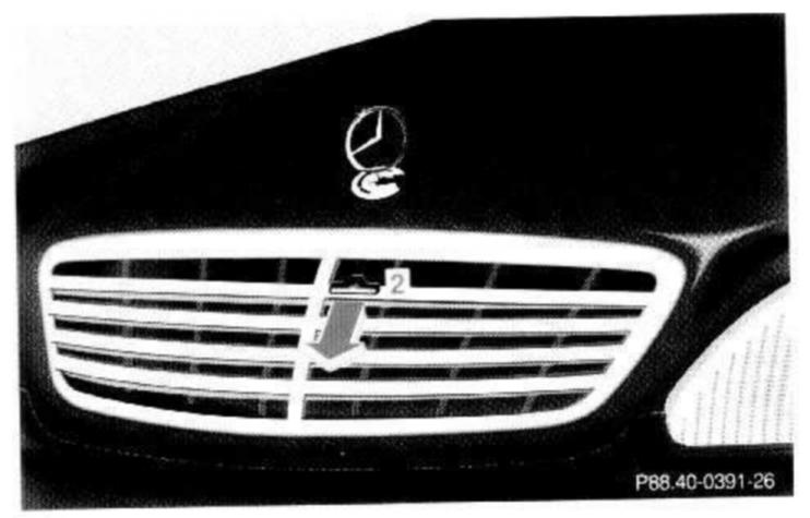 To unlock the hood, pull release lever (1) under the driver's side of the instrument panel. At the same time a handle will extend out of the radiator grill (it may be necessary to lift the hood up slightly).