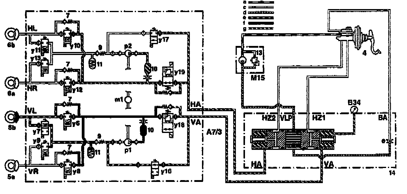 The brake fluid returned at the same time by the high-pressure/return pump (p1) is also fed back into the charging pressure circuit of the front axle though the pressure limiting valve (170 bar) integrated in the switchover solenoid valve (y18).
