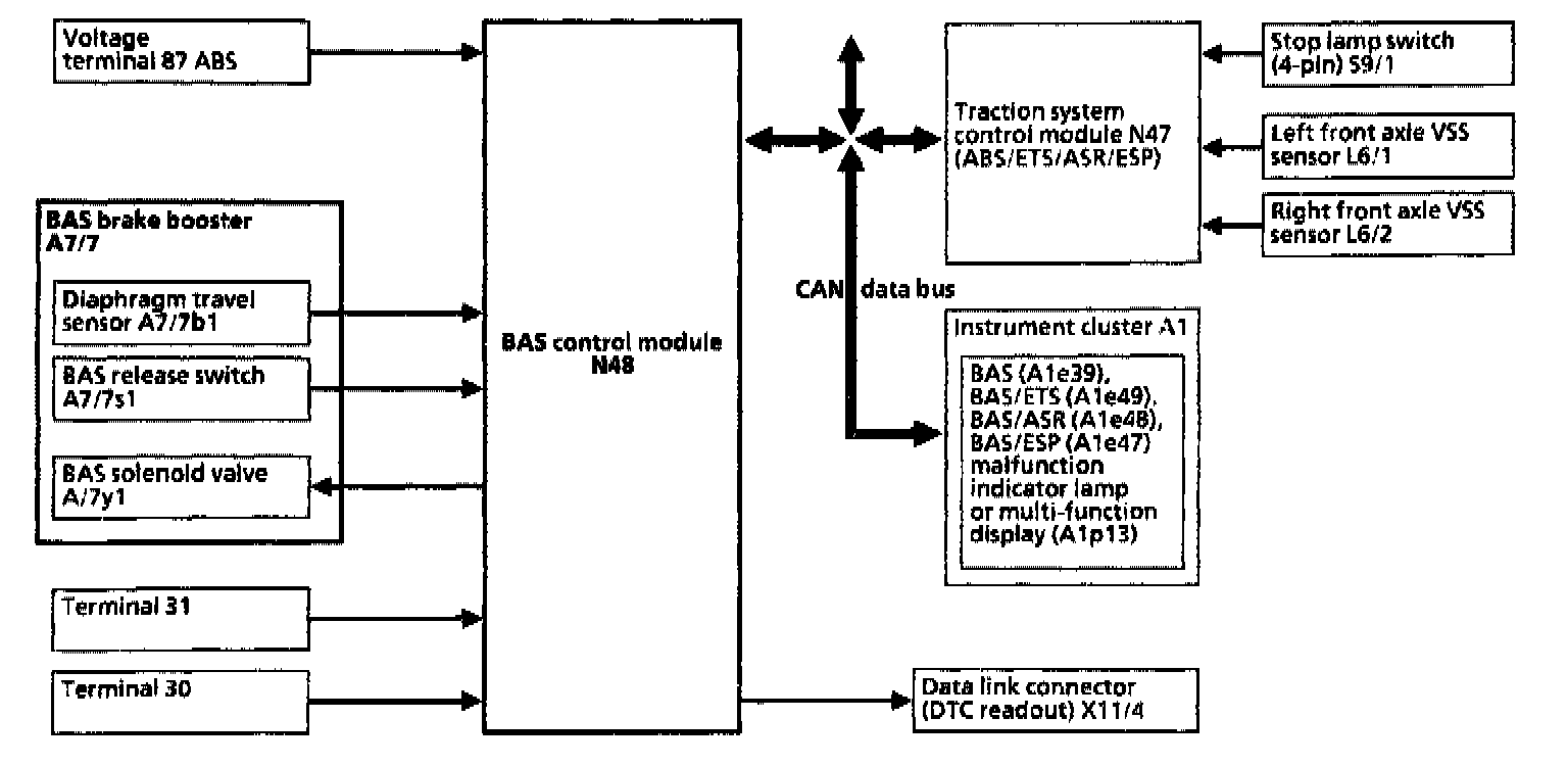 The BAS solenoid valve (A7/7y1) is actuated by the BAS control module (N48) and the brake booster produces the maximum brake boost.