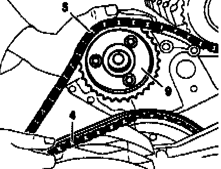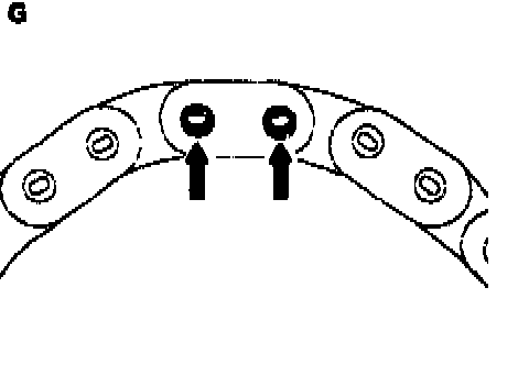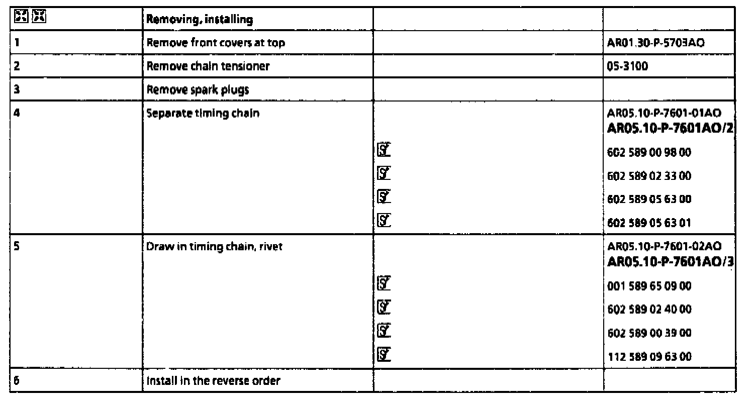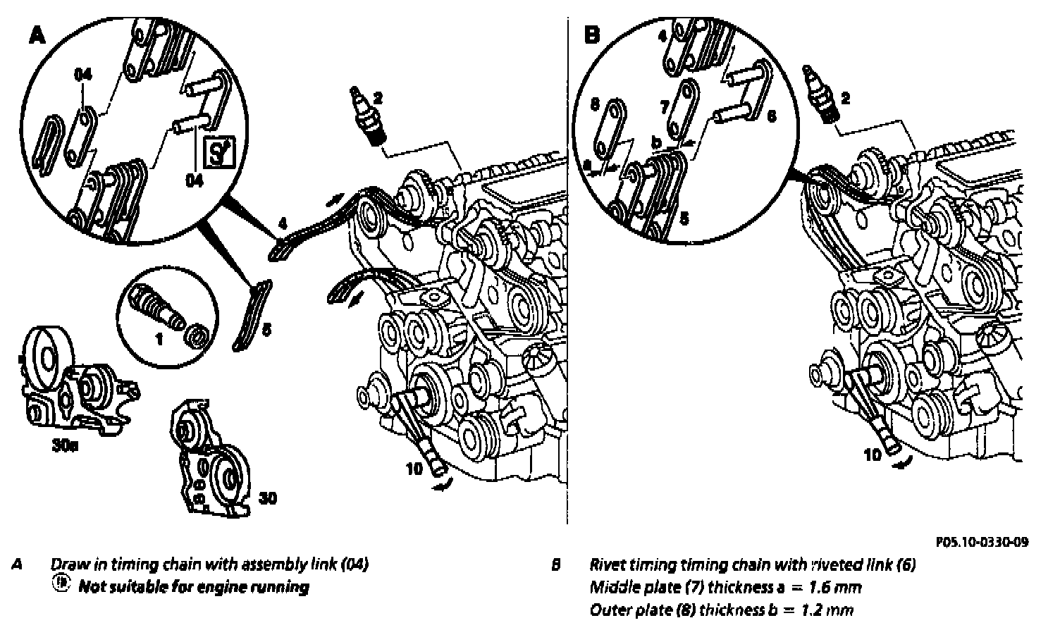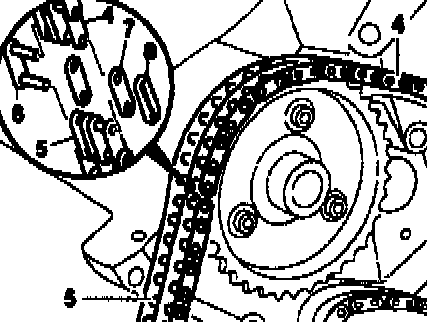 5 Insert the ends of the new timing chain with riveted link and middle plate (thickness 1.6 mm) from the rear.