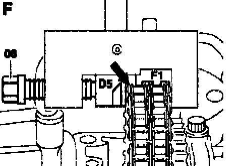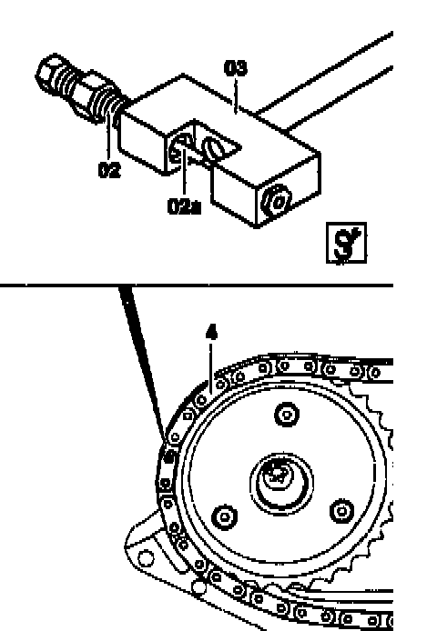 4 Screw in thrust spindle (02) sufficiently until thrust pin (02a) is resting against timing chain pin (arrow).
