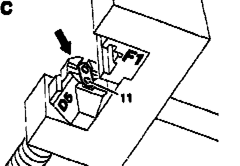 11 Turn over thrust piece (D5) to the riveting side (arrow), (Fig. E).