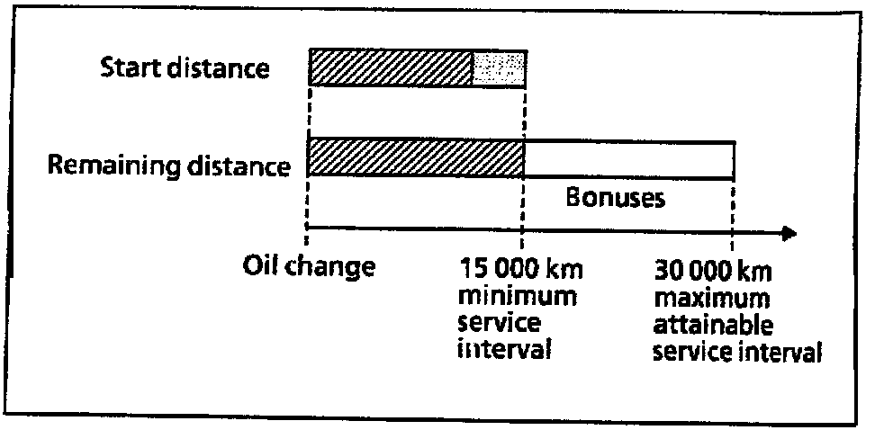 Each time the oil is changed, the start and remaining distances are set to the initial value. In this case, the normal value of 15 000 km is entered as the start distance (top bar) (shaded + dark section). The start distance may differ from 15 000 km (e.g. 14 000 km; shaded section) if the quality factors do not correspond to the basic setting. In the case of engines fitted with oil sensor (e.g. 112, 113, 166) the start distance may also be less than 15 000 km if the specified oil quantity was not added during the oil change. The remaining distance (bottom bar) is always 15 000 km, however, immediately after an oil change. In addition, the service interval is always at least 15 000 km.