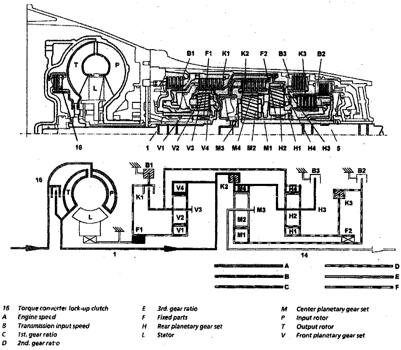 - Via the input shaft (1) and using all three planetary gear sets the torque from the torque converter is multiplied and transmitted to the output shaft (5).