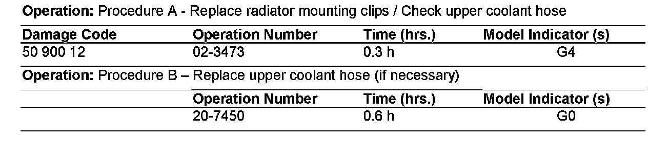 It has been determined that the upper radiator mounting clips in above model need to be replaced. The new mounting clips are made of metal whereas the old clips are made of plastic. Please perform this Service Campaign during the vehicle's next scheduled service visit.