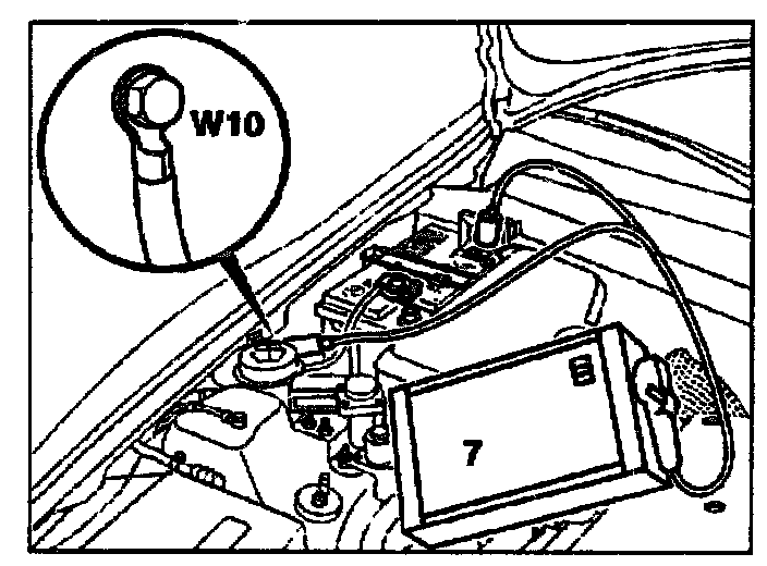 - Connect terminal on negative lead (-) to battery ground (W10)