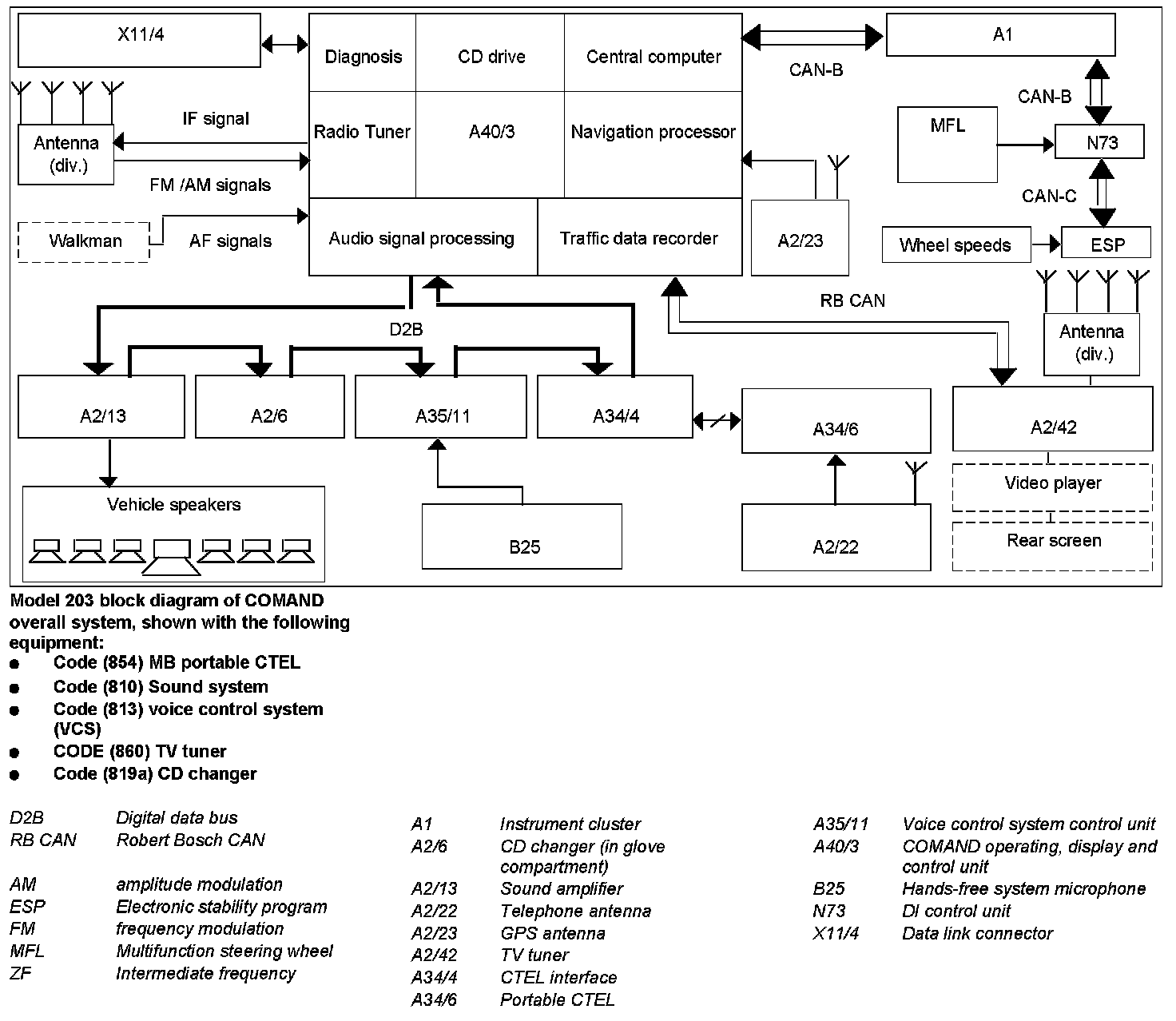 The RB CAN which is independent of the CAN-B serves to exchange data between the COMAND operating, display and control unit (A40/3) with the optional components TV tuner (A2/42) on model 209 and as from 1.7.02 for model 203.
