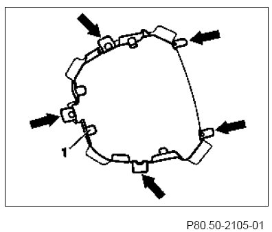 6 Insert reinforcing frame (1) from the rear of the roofliner into the installation opening.