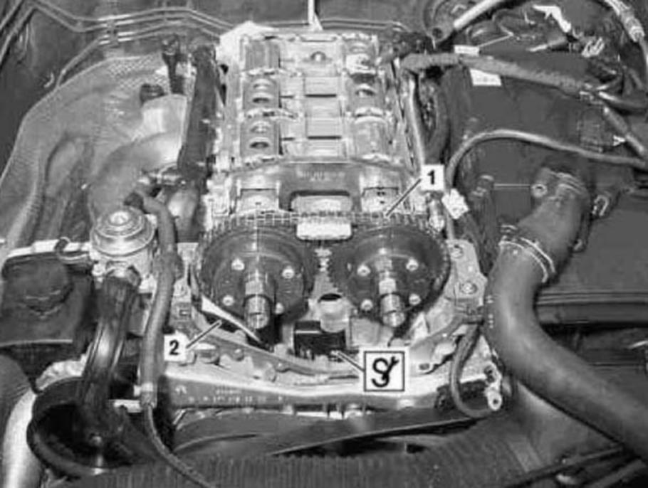 (1). To do this, insert the wedged in the timing case and push back the tensioning rail (2).