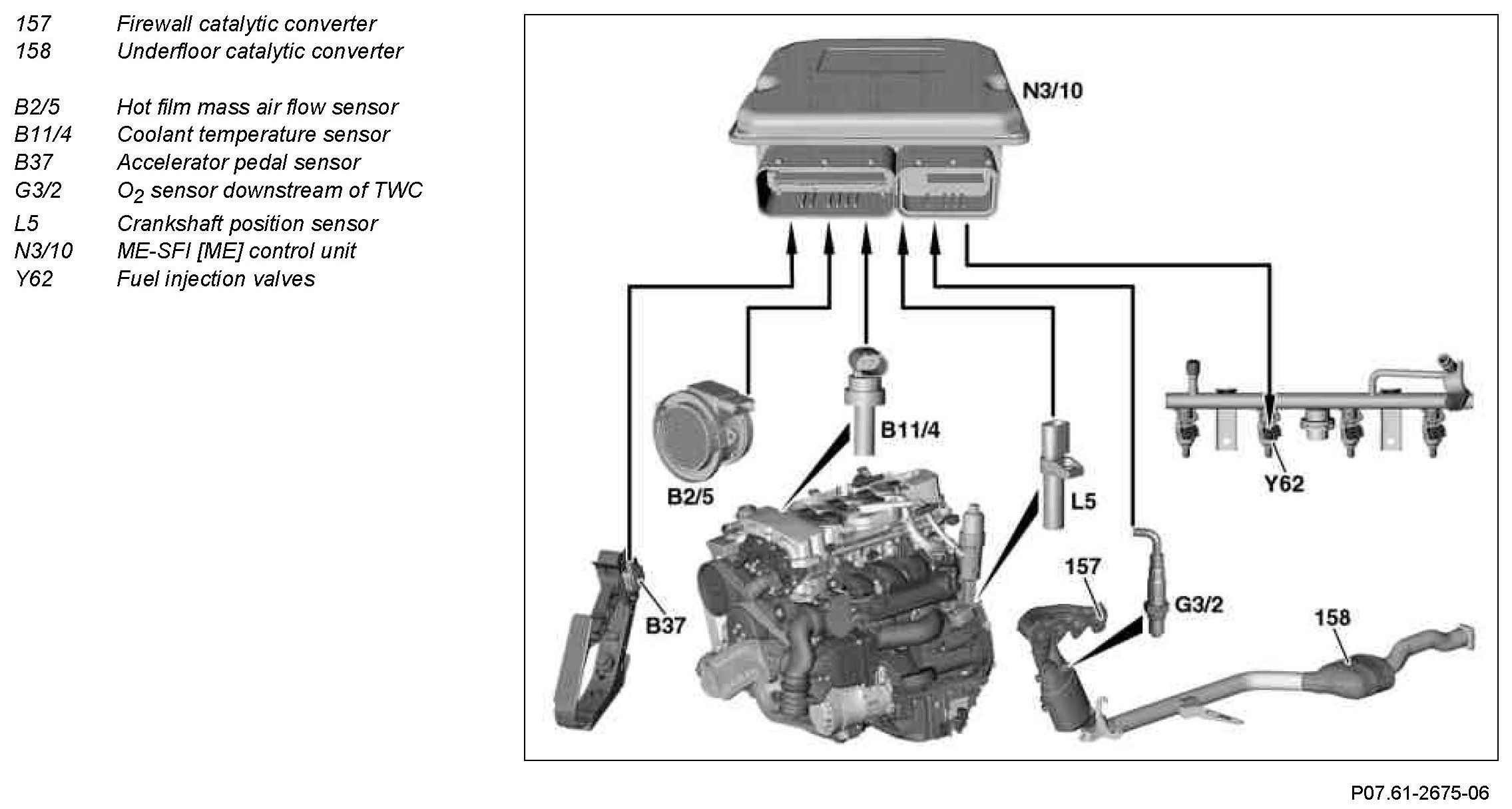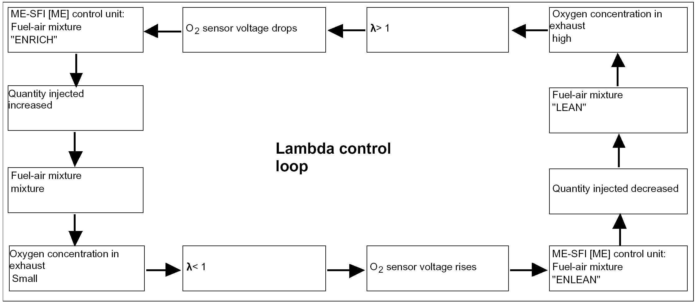 The O2 sensor upstream of TWC reacts to the oxygen share in the exhaust and transmits a corresponding voltage signal to the ME control unit. Consequently, the mixture composition is modified by control of the injection quantity, so that lambda=1 is obtained. This process is repeated constantly (control loop).