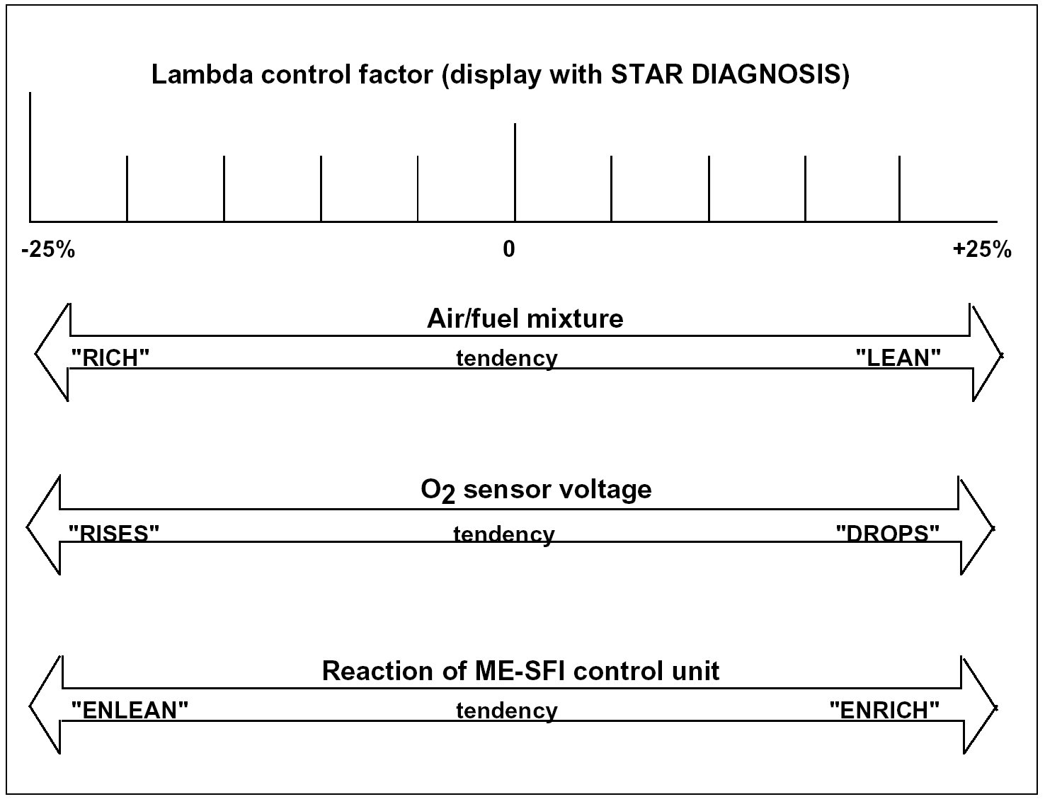 The reading of the lambda control factor with the STAR DIAGNOSIS moves towards +25 % The more the lambda control factor moves in the direction +25%, the leaner is the fuel-air mixture and the greater is the enrichment of the mixture on the part of the ME control unit.