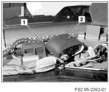 3 Connect free plug of adapter line (1) to the pulled coupling from the E-call control module (A35/8) and wrap with felt tape (left photo).