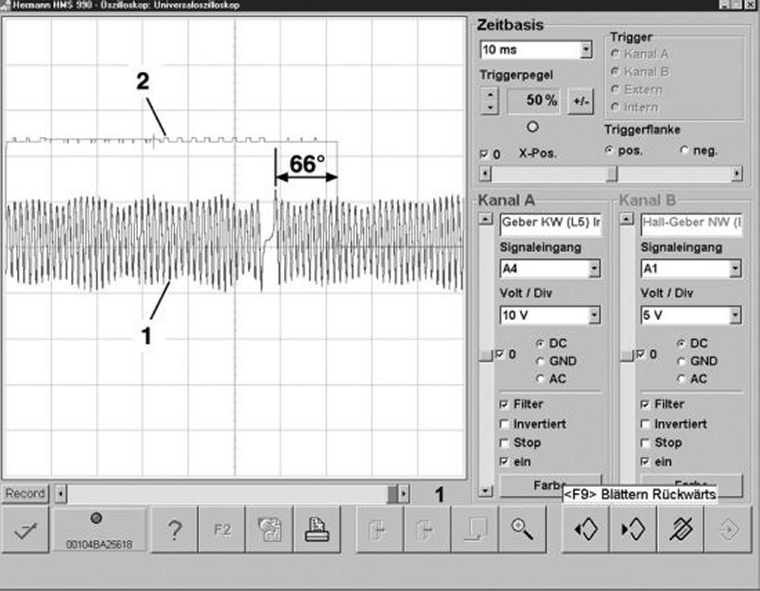 - Compare the oscillogram with the characteristics specified for component B6/4 (Left intake camshaft Hall sensor). [1 ... 600] V Sinusoidal signal (Amplitude)