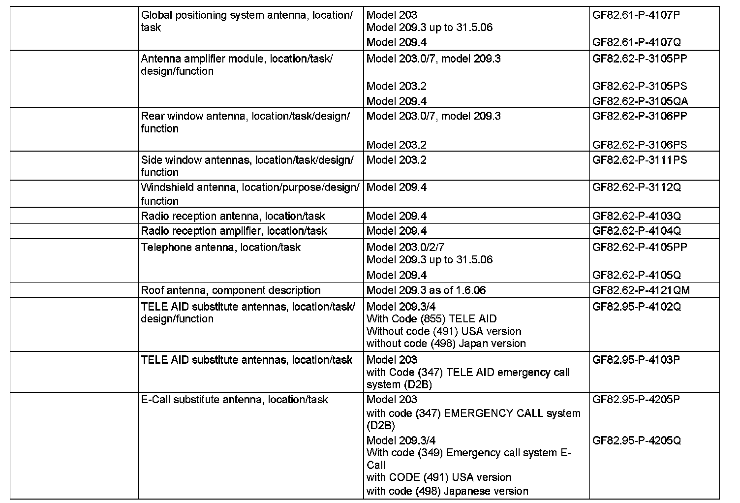 For example, the telephone antenna (A2/22) (model 203, model 209.4, model 209.3 up to 31.5.06), telephone antenna (A2/49a1) (model 209.3 as of 1.6.06), GPS antenna (A2/23) (model 203, model 209.4, model 209.3 up to 31.5.06) or GPS antenna (A2/49a2) (model 209.3 as of 1.6.06).