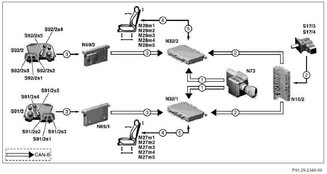The adjust request is read in by the left front door control unit (N69/1) and forwarded via the CAN-B (CAN-B) to the driver-side front seat adjustment control unit with memory (N32/1).