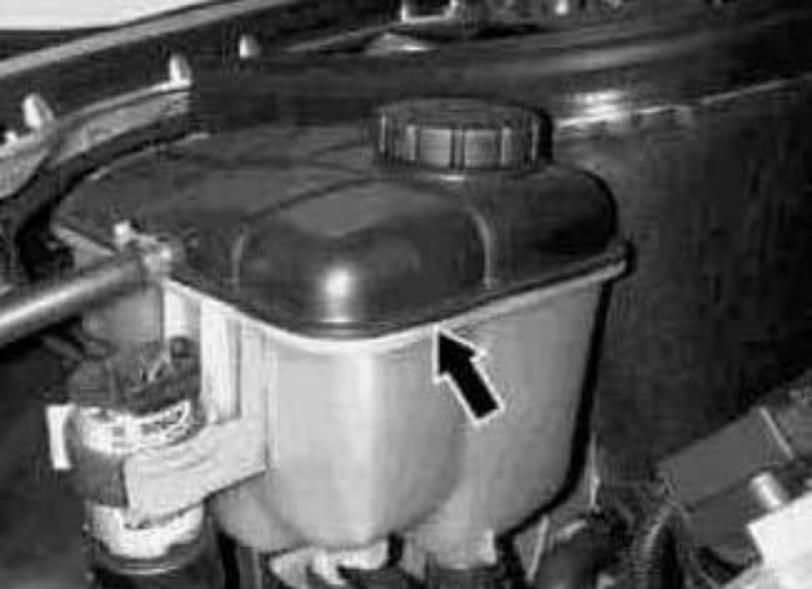When the engine is cold, the coolant level must extend up to the marking (arrow) on the coolant expansion reservoir.