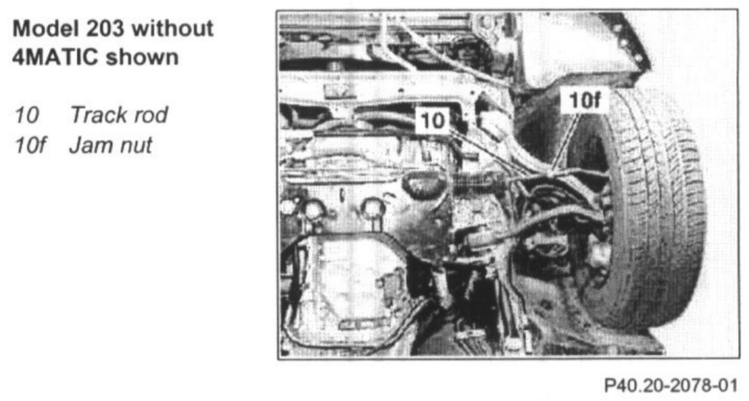 - Adjust toe by slackening the lock nut (10f) and twisting the tie rods (10).