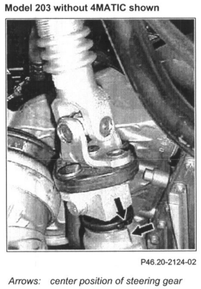 - The steering gear is in the center position when the marking on the cap aligns with the marking on the control valve housing (arrows). If necessary, offset the steering wheel by a maximum of one tooth