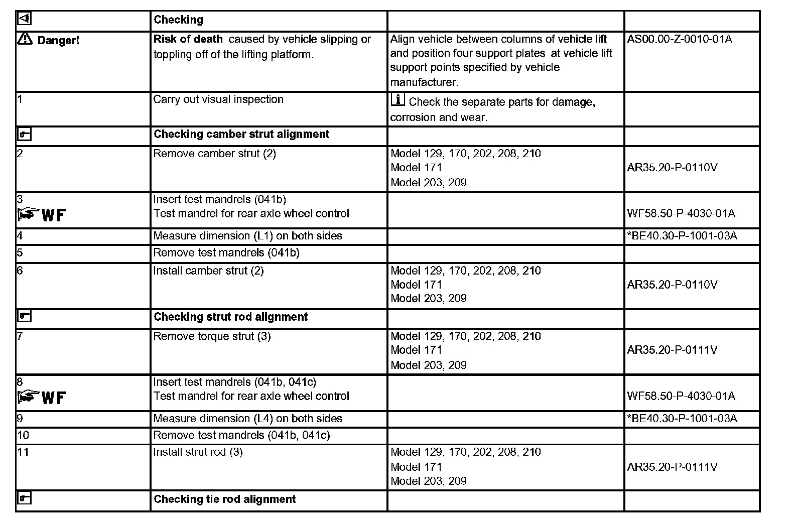 Rear axle check values - thrust/strut/camber strut, spring control arm, tie rod: