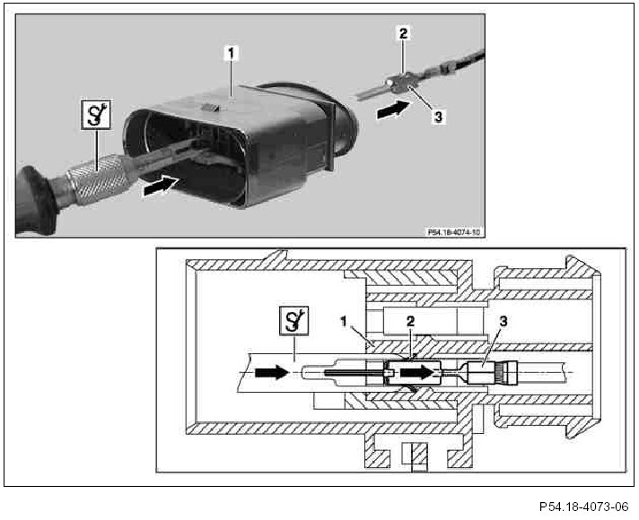 2 Pull lightly on the corresponding line to remove the contact pin (3) from the plug (1).