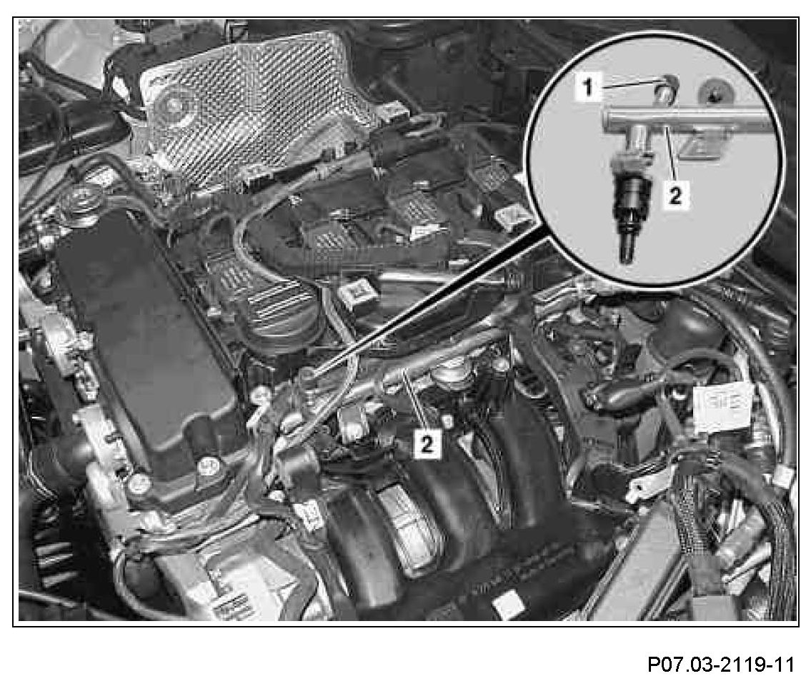 1 Unscrew cap (1) from service valve on fuel distributor (2).