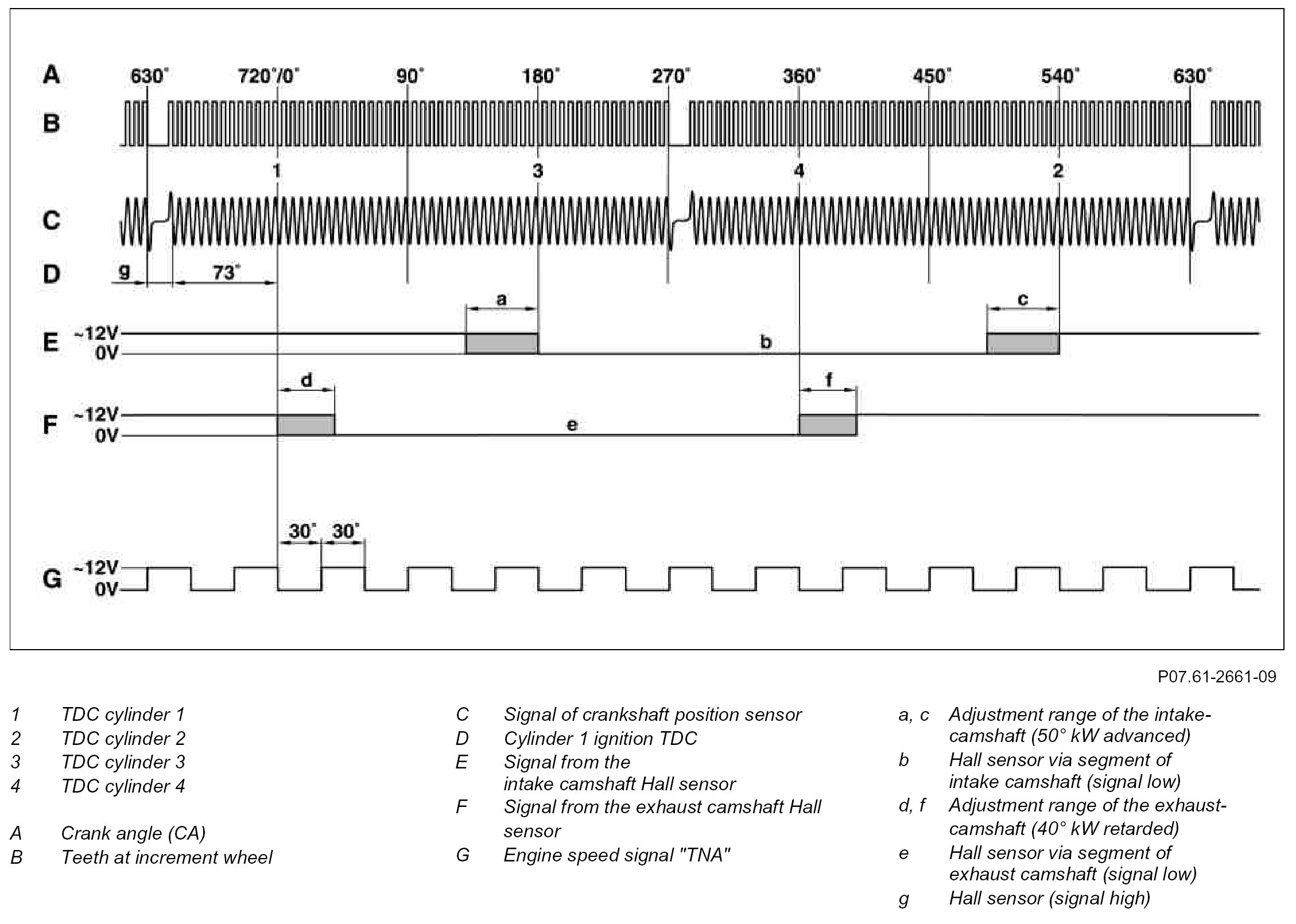The teeth on the clutch plate or flywheel causes the crankshaft position sensor to generate an AC voltage for a rotating crankshaft. During this operation, each tooth generates an alternating voltage signal. No voltage is generated as a result of the gap created by 2 missing teeth. 73° crankshaft angle after the gap, the ME control unit detects the TDC position of cylinder 1.
