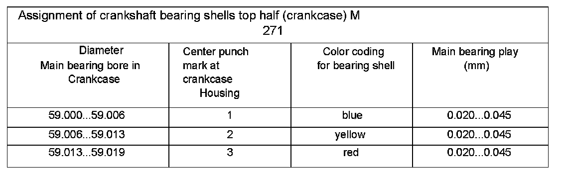 The color coding of the bottom crankshaft bearing shells is indicated on the reverse side of the crankshaft bearing shells.