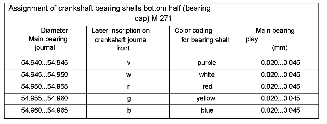 The bottom crankshaft bearing shells are assigned to the basic journal of the crankshaft by means of letters (initial letter of the particular color).