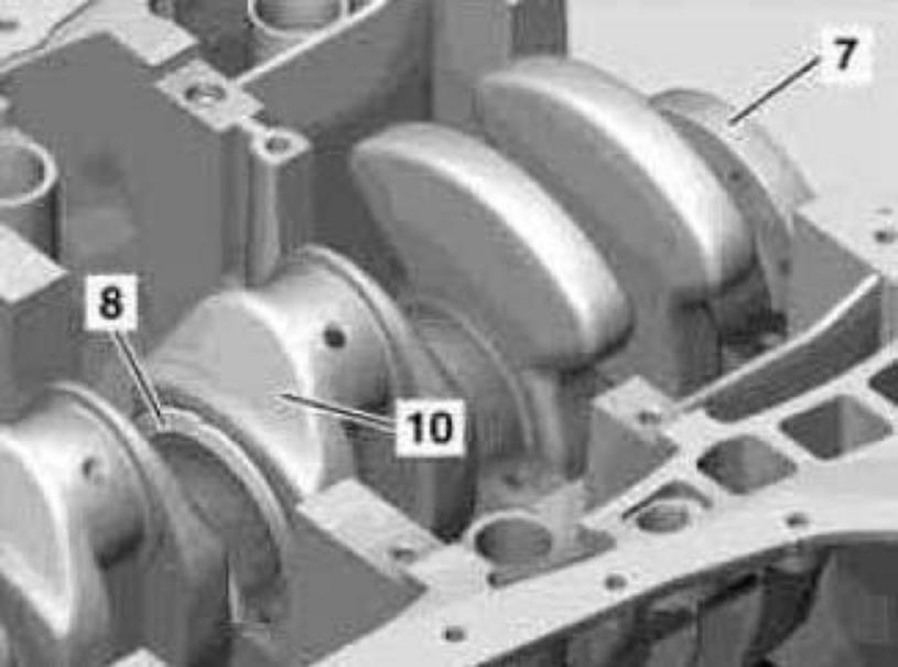 3 Insert bottom crankshaft bearing shells (7) into the crankshaft bearing caps (6). m Ensure that the anti-twist locks (5) of the bottom crankshaft bearing shells (7) are seated in the recess clearances of the crankcase (6).