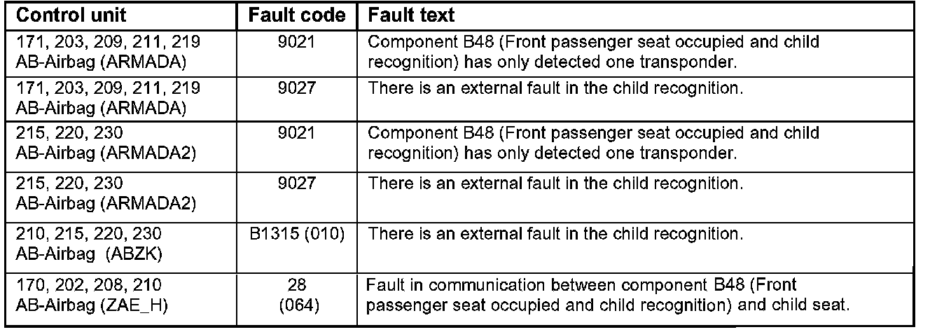 If you receive customer reports in the above model vehicles with the SRS warning lamp illuminated and any of the above DTCs stored, please make note of the fault tracing information shown. To properly diagnose this issue, please follow the SRS fault tree in Star Diagnosis (SDS). This fault tree can be found in a quick test by selecting the stored DTC. If no faults are found, the cause could be a memory card with a transponder chip has been placed on the passenger seat. Company ID cards, notebook computers, PDAs, and other electronic equipment may contain such memory cards that cause interference with the Baby Smart(TM) transponder. This interference can be interpreted as a fault by the SRS control unit. This condition may be difficult to duplicate in the workshop. Please alert the customer not to place items containing memory cards on the passenger seat. Replacement of components will not remedy the situation.