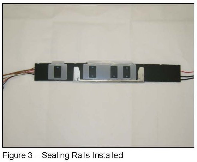 4. As shown in Figure 3, attach the sealing rails to the amplifier module. The ears on the sealing rail should be evenly spaced to the double sided tape on the underside of the module as shown in Figure 3.
