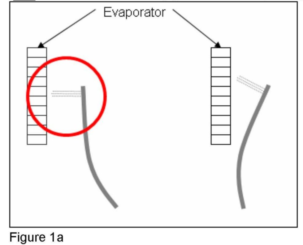 Contra Sept is applied using a spray gun attached to a long probe. It is imperative to have as much of the evaporator sprayed with the cleaner by moving the probe in / out and up / down inside the case. It may be necessary to bend the probe in order to gain access. The cleaner is applied and allowed to dry. Refer to Figure 1a for spraying angle recommendation.