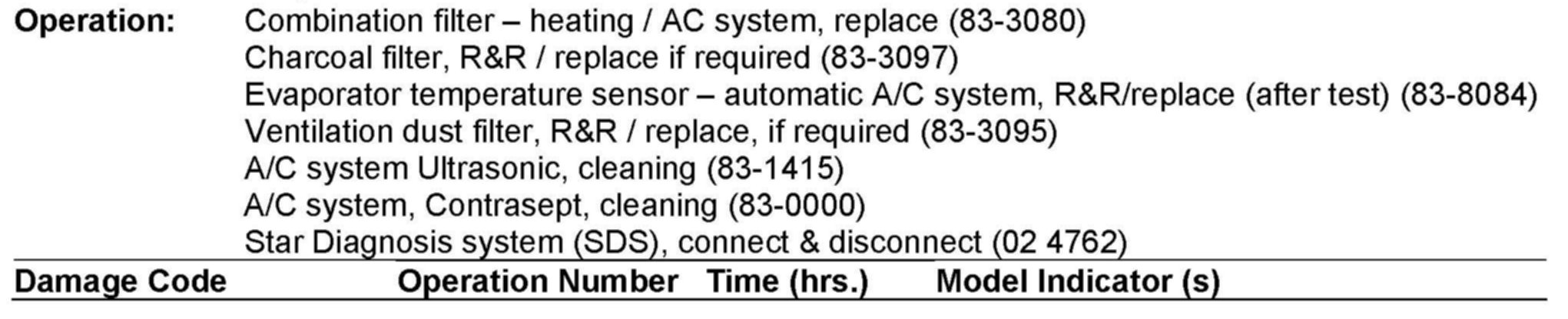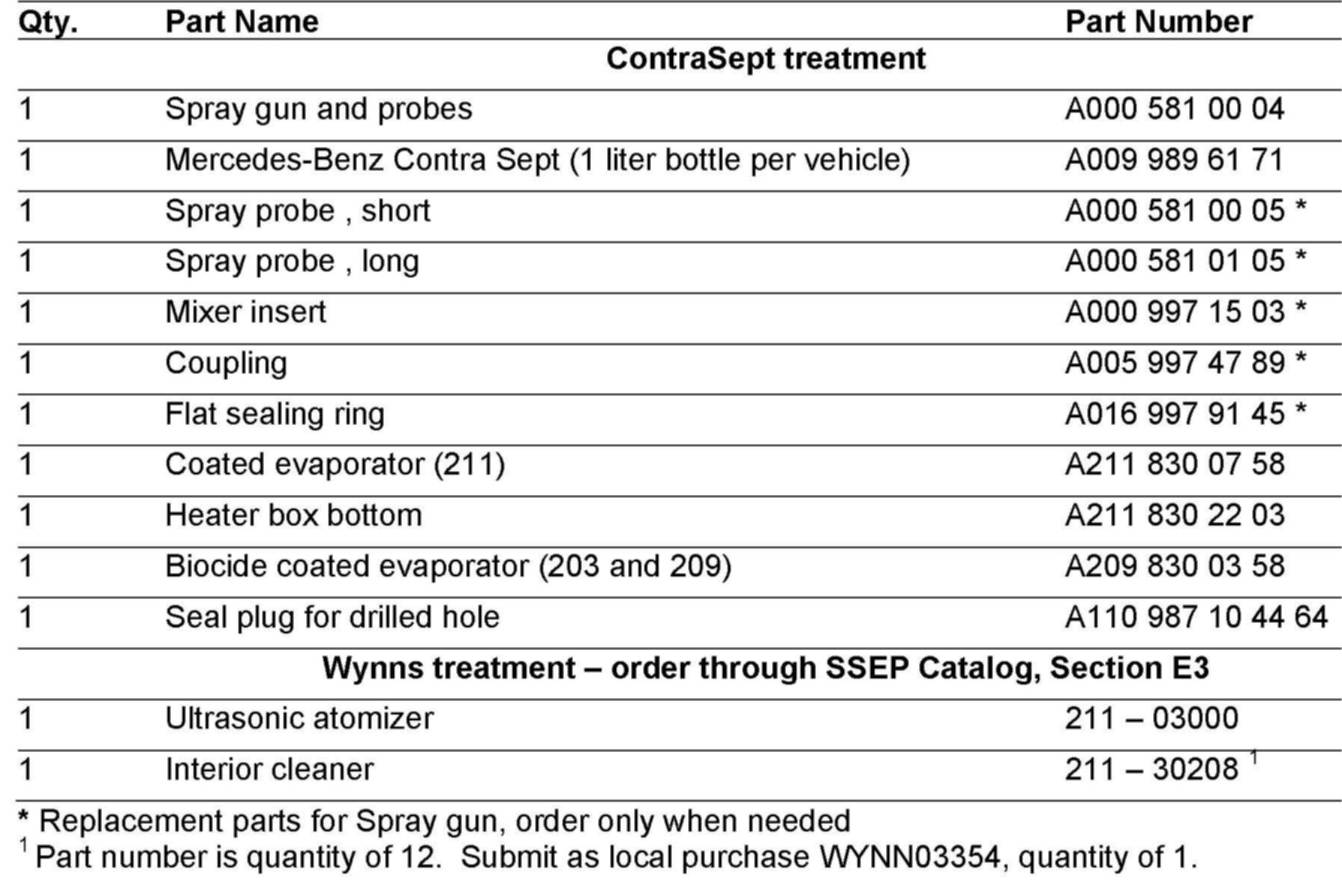 If you receive customer reports in the above model vehicles regarding a musty/moldy odor from the air conditioning system, the evaporator should be cleaned using Mercedes-Benz Contra Sept and the interior using the "ultrasonic atomizer", refer to WIS document AR83.30-P-5556A. For the best lasting results, follow the instructions provided below.