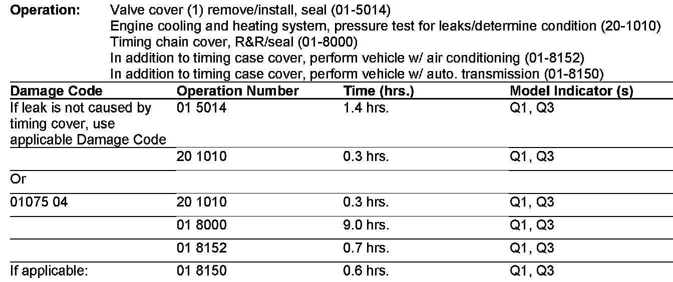 If you receive customer reports in the above model vehicles of the below warning message in the instrument cluster display, this may be caused by the sealing rings for the coolant ducts of the coolant pump between timing case and crankcase leaking which allows coolant to enter the oil pan via the timing case.