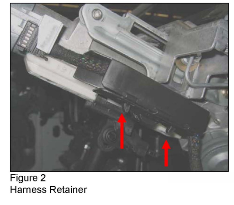 3. Remove the SCM harness from the jacket tube by releasing lock tabs on both sides of the connector (Figure 1). If present, release harness from retainer (Figure 2). Gently pull the harness out from under the instrument panel to gain access.