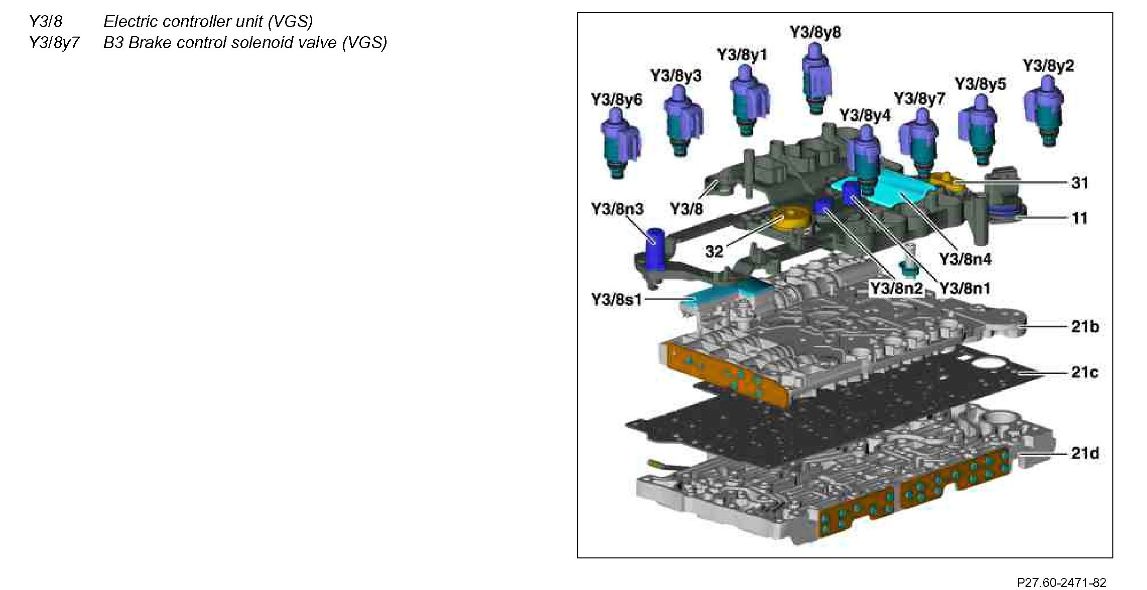 The brake control solenoid valve B3 (VGS) (Y3/8y7) is actuated by the fully integrated transmission control unit (VGS) (Y3/8n4) and influences the position of the regulating valve B3. The pressure in the multidisk brake B3 depends on the regulating valve position and therefore on the geometry of the regulating valve B3