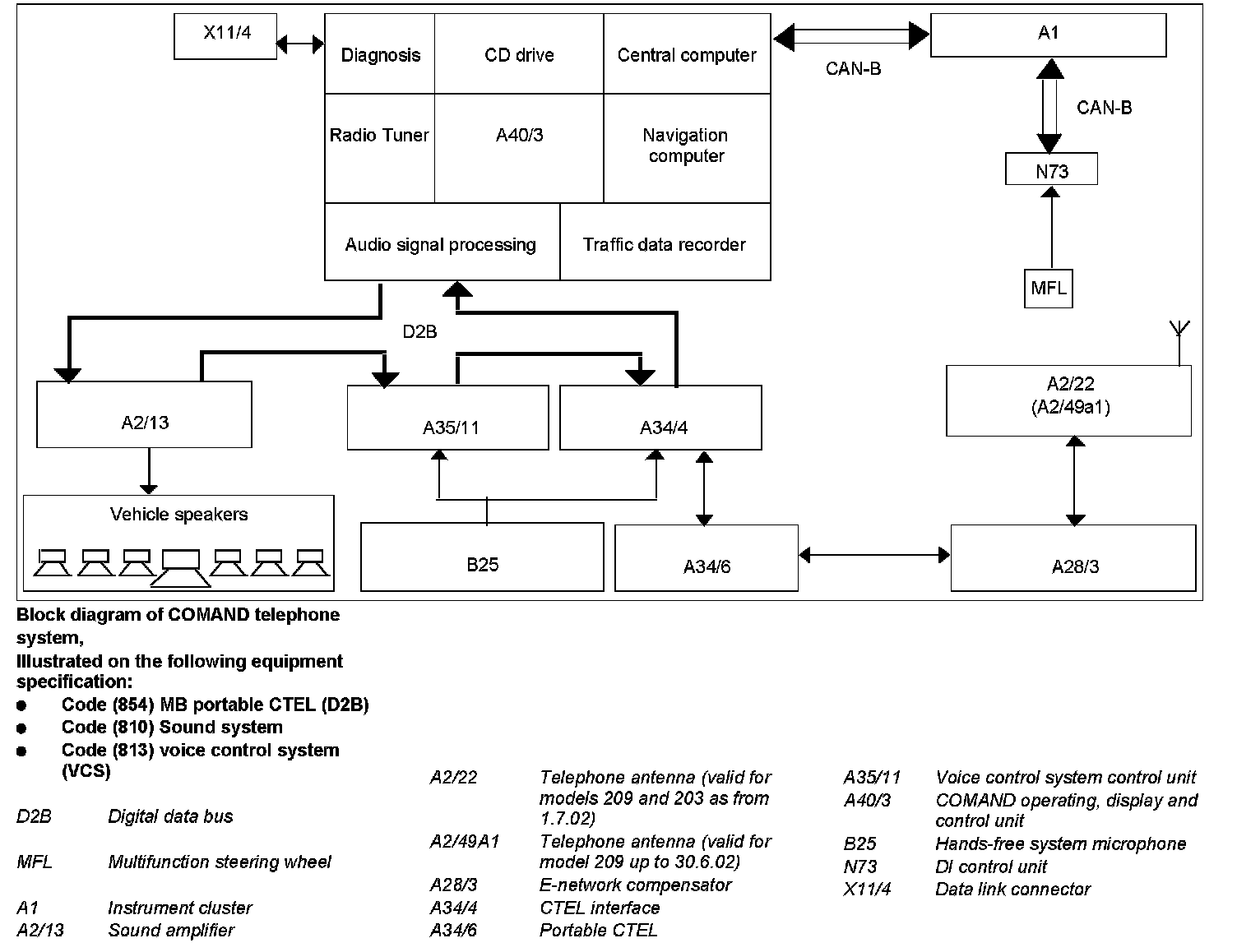 The telephone radio signals are sent and received over the telephone antenna (A2/22) (telephone antenna (A2/49a1) for model 203 up to 30.6.02). The display of the COMAND operating, display and control unit (A40/3) shows when the telephone is in its ready status the destination field strengths in 5 grades. All control and wanted signals (e.g. audio signals from activated hands-free system) are transferred via the digital data bus (D2B). The portable CTEL (A34/6) requires here an interface to the D2B, which is realized by the telephone interface (A34/4).