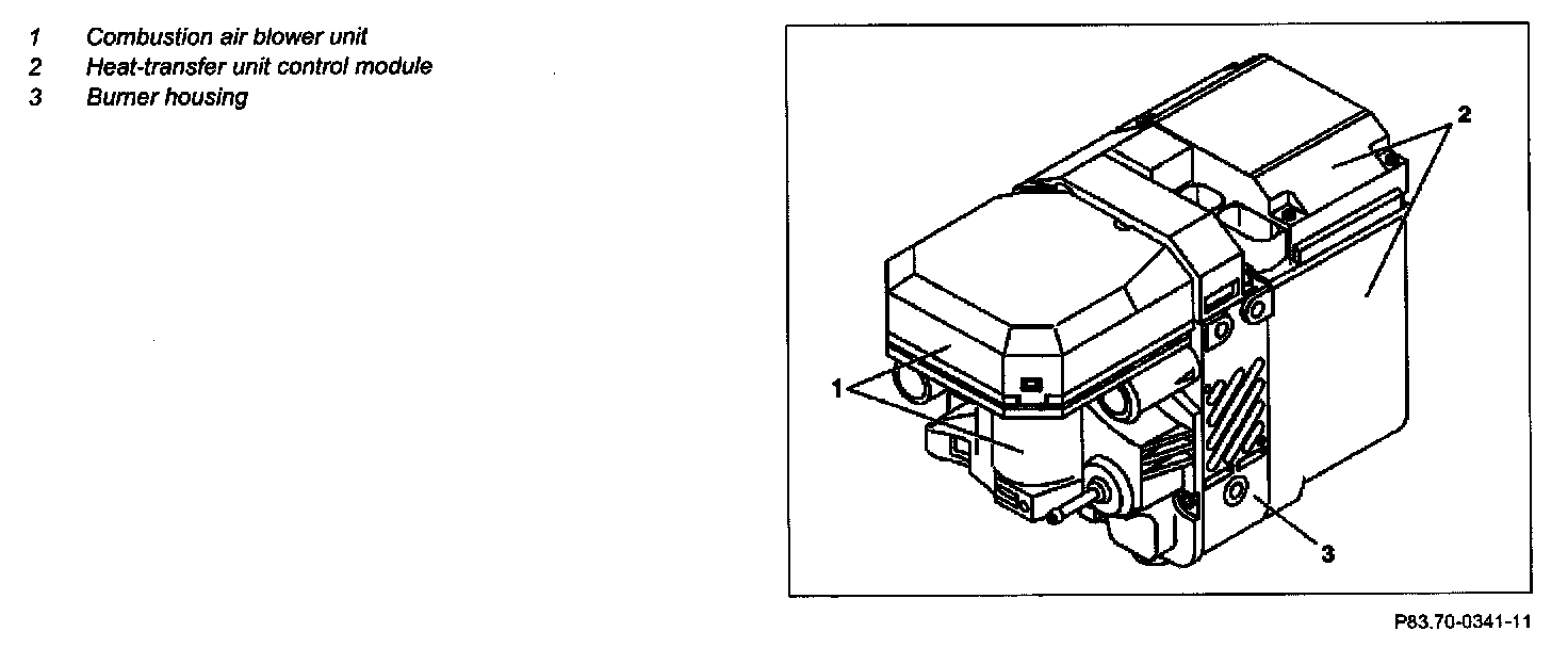 It is located between the combustion air blower unit (1) and the control module/heat exchanger unit (2).