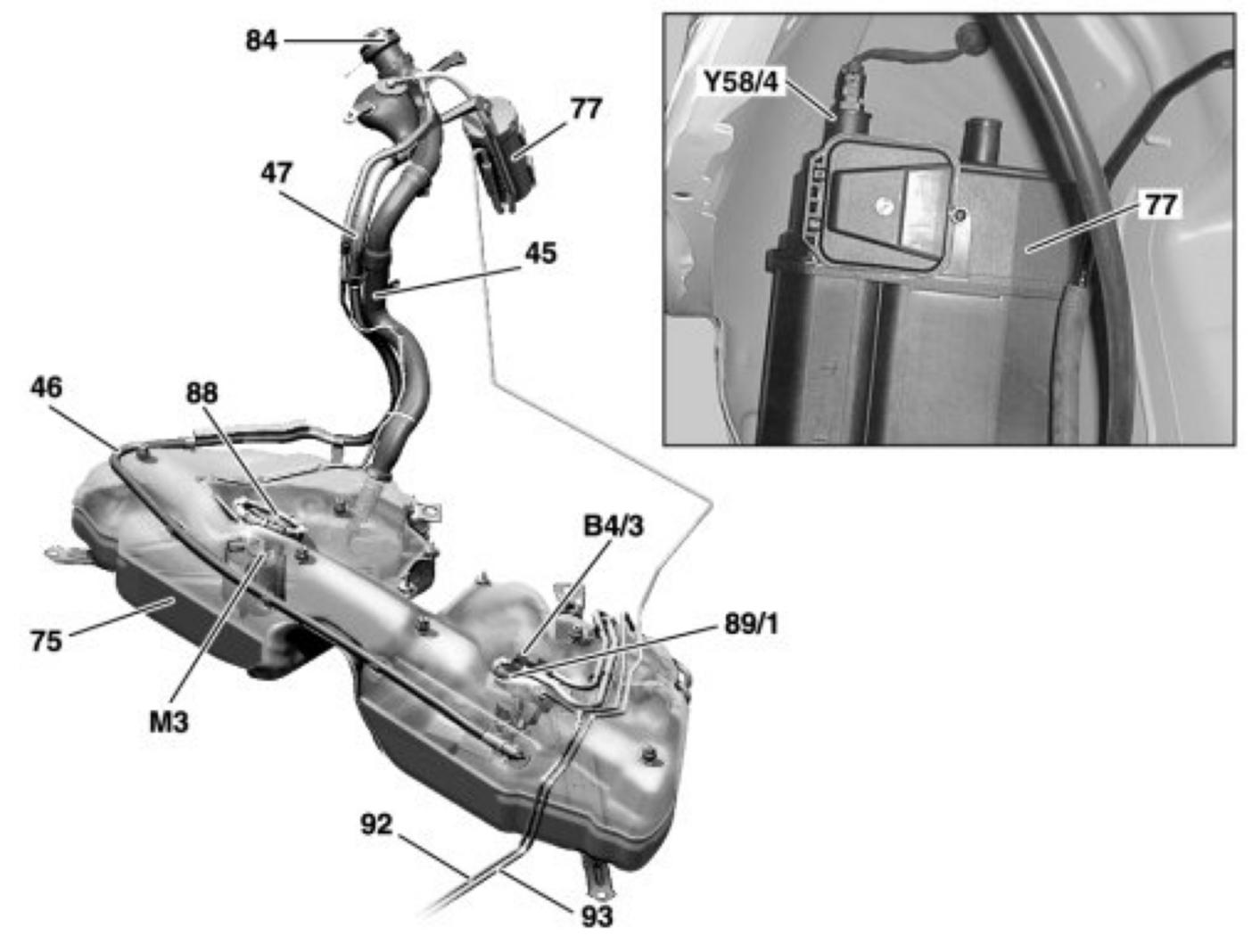 The fuel tank (75) is split into two chambers because of the "U"-shaped recess. The chambers are connected to each other.